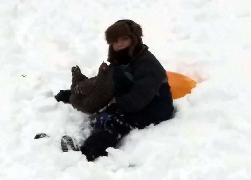 アメリカ、マサチューセッツ州の農場に引き取られたニワトリは、子供と仲良くなりどこにでもついていくようになり、その影響でソリで雪の斜面を滑るのが大好きになったという。