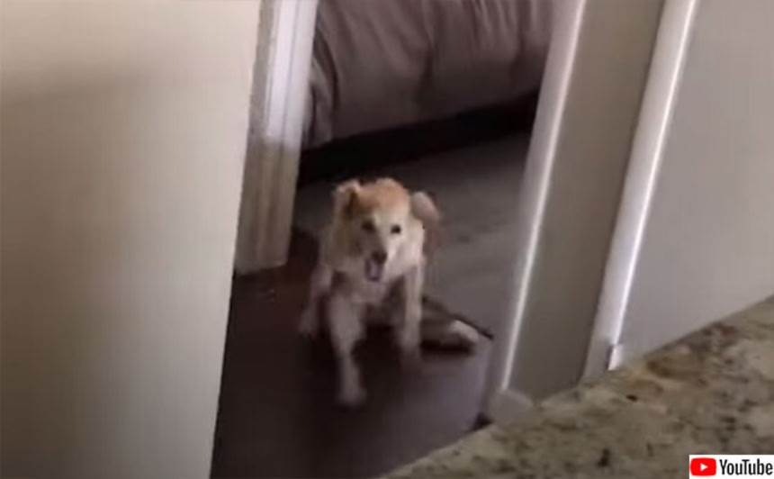 足の不自由なその犬に、二階から降りてきた飼い主が「何してるの~?」と声をかけた。犬はその声を聞いて大興奮。脚を引きずりながら犬なりの全力で飼い主の元へと移動しようとする。