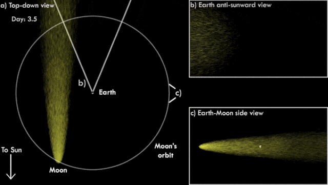 隕石で舞い上がった微粒子が月の周りに纏わりついてて、太陽風で流されるときエネルギーを貰い黄色く光るんだね。