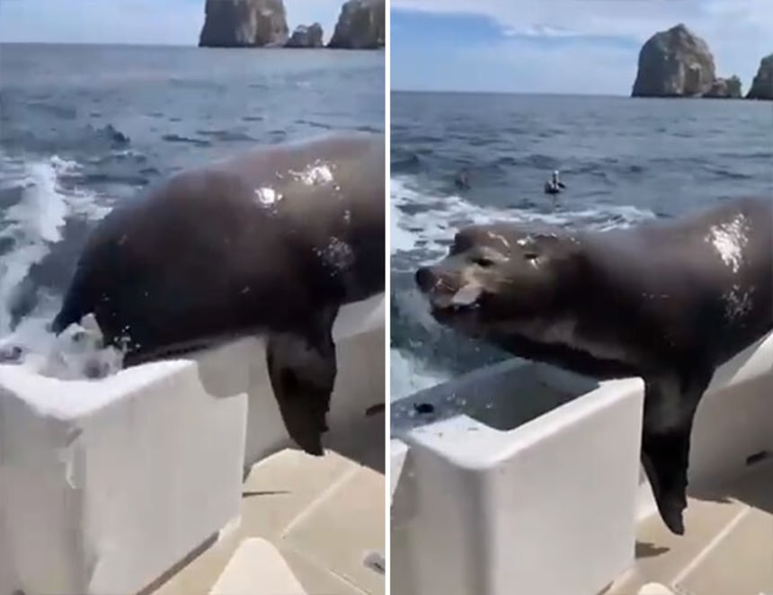この画像を大きなサイズで見るだがアシカはそれくらいじゃ満足しなかったようだ。ボートに飛び乗ると、水槽に顔を突っ込み、そこにいた魚全てを食べきってしまったようだ。