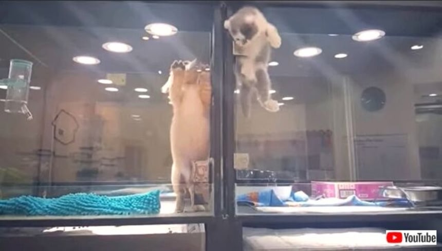 お隣にいるお友だちと、いっしょに遊びたい一心で、仕切りを乗り越えようとする子猫。2匹はいっしょになれたのかな?