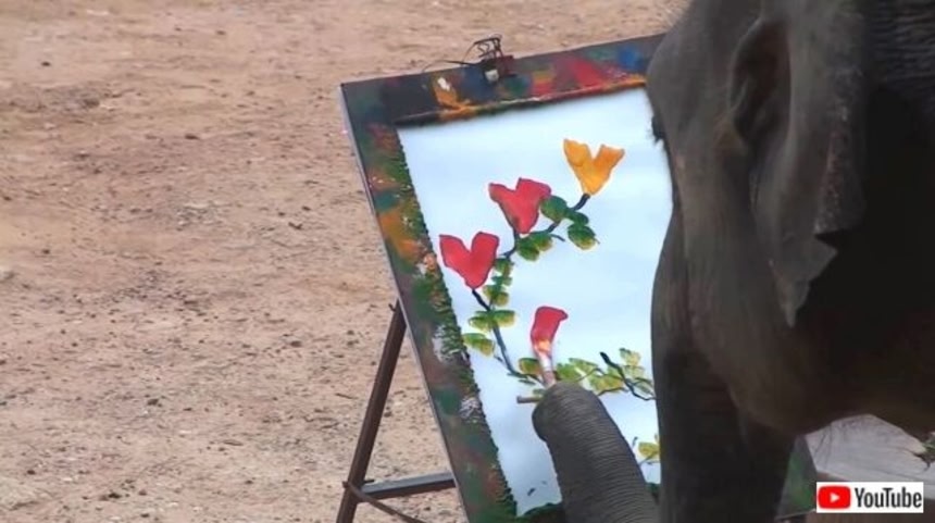 天才的なお絵描きの才能を見せてくれる象。日本の「市原ぞうの国」にも、お絵描き上手な象さんたちがいるけど、こちらはタイにいる象さんだそうだよ。