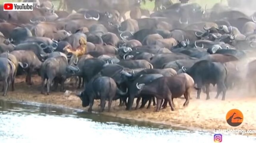 ライオンなんて敵じゃない!アフリカスイギュウの大群に取り囲まれてしまったメスライオン