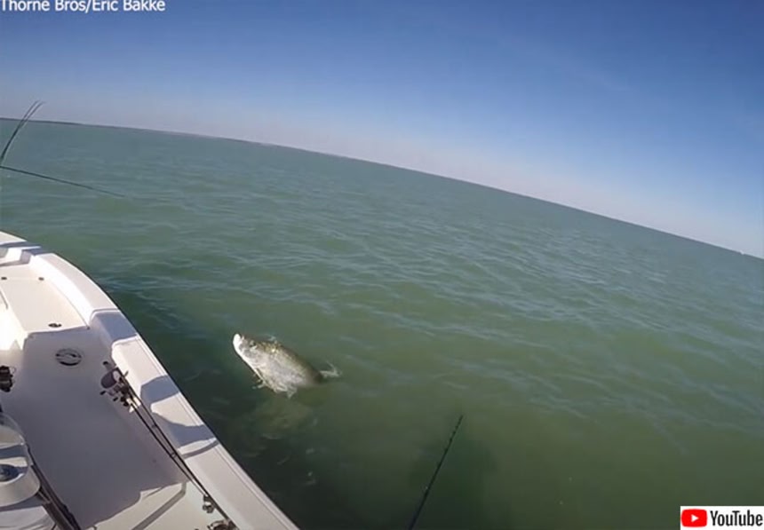 魚はそのまま海へと戻っていったが、もうすこし位置がずれていたら顔面に激突するところだった。まさに魚雷とのようなこの魚の正体は、古代魚として知られるターポンである。