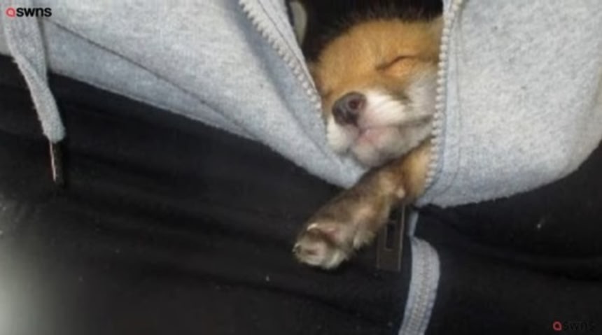 まだ小さなその子ギツネは、保護区を訪れた狐の保護活動を行っている男性にロックオン。いきなり近づくと男性の袖の中に入りこみ、そこで眠ってしまうほどに気に入ってしまったようだ。