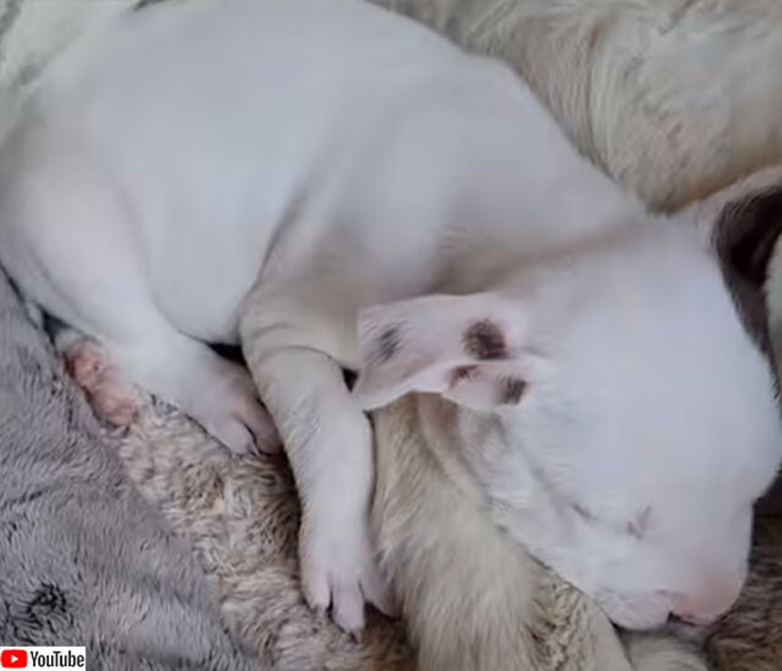 ピットブルの子犬かな。すやすや寝てるの可愛い。足としっぽを寝具にされてるのに大きな子も全く気にしてなくてやさしい世界。