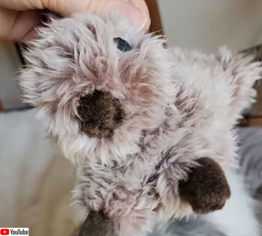 終始、おもちゃをかじり続けている犬だが、その手の下からできたのはやはり、かじる用の円形のおもちゃ。