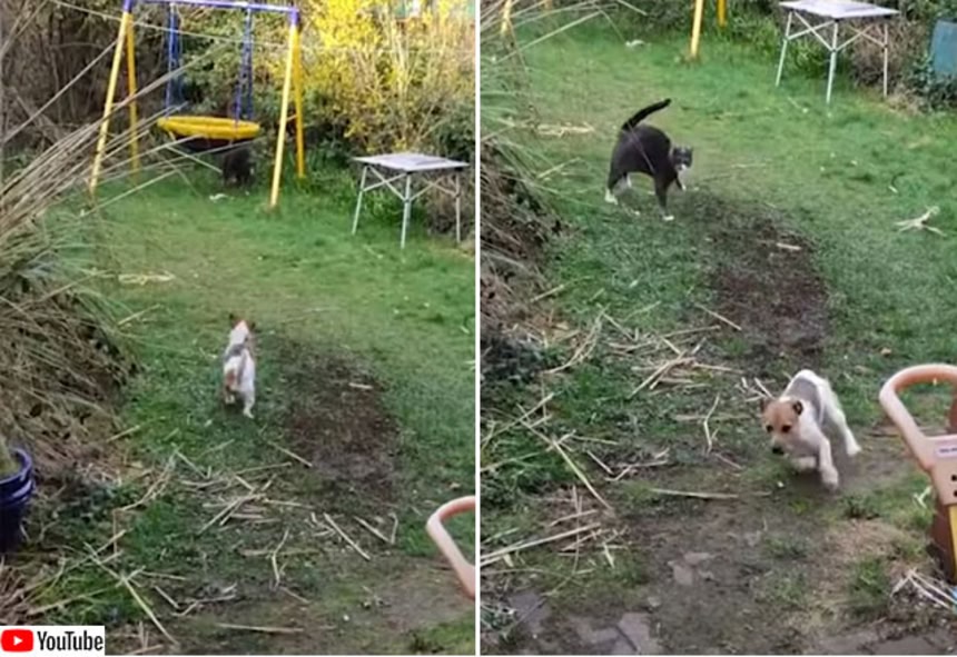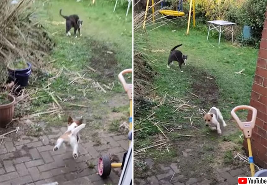この画像を大きなサイズで見る隣の家の猫が庭に入ってきたところを見逃さなかったのは、この家の飼い犬である生後8ヶ月のジャック・ラッセル犬、ビンゴである。