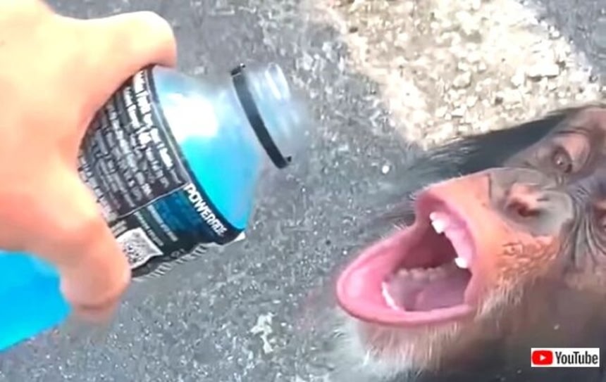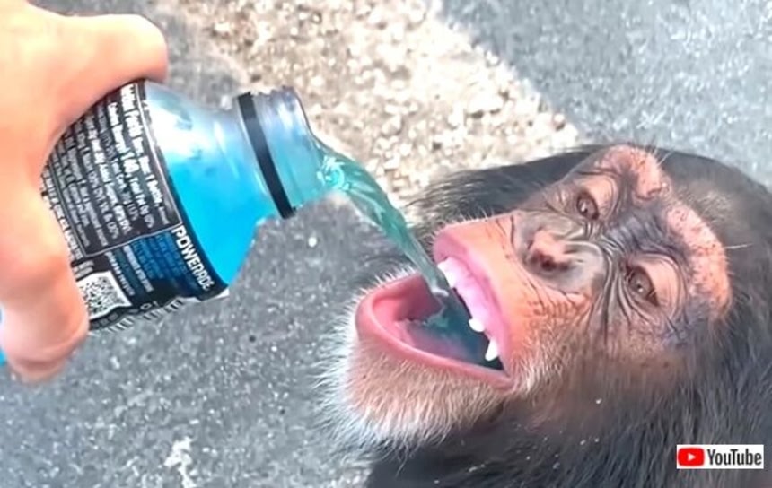 この画像を大きなサイズで見るよっぽど喉が渇いていたんだろうけれど、この飲み物はパワーエイドというスポーツドリンクの一種だと思う。コメント欄のお友だちからは、「これ、チンパンジーが飲んでいいの?」という声も上がっていたよ。
