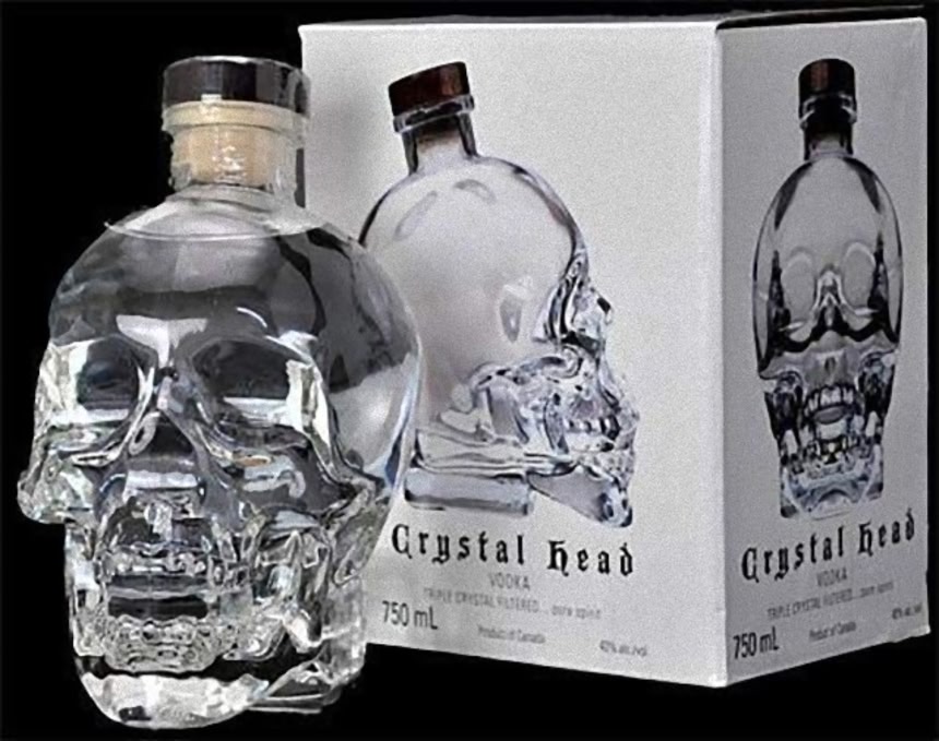 俳優のダン・エイクロイドがデザイナーと立ち上げたことでも知られるカナダのクリスタル・ヘッド・ウォッカ社の製品は、世界に13個あるとされるクリスタルスカル(水晶髑髏)にちなんだデザインボトルを採用している。