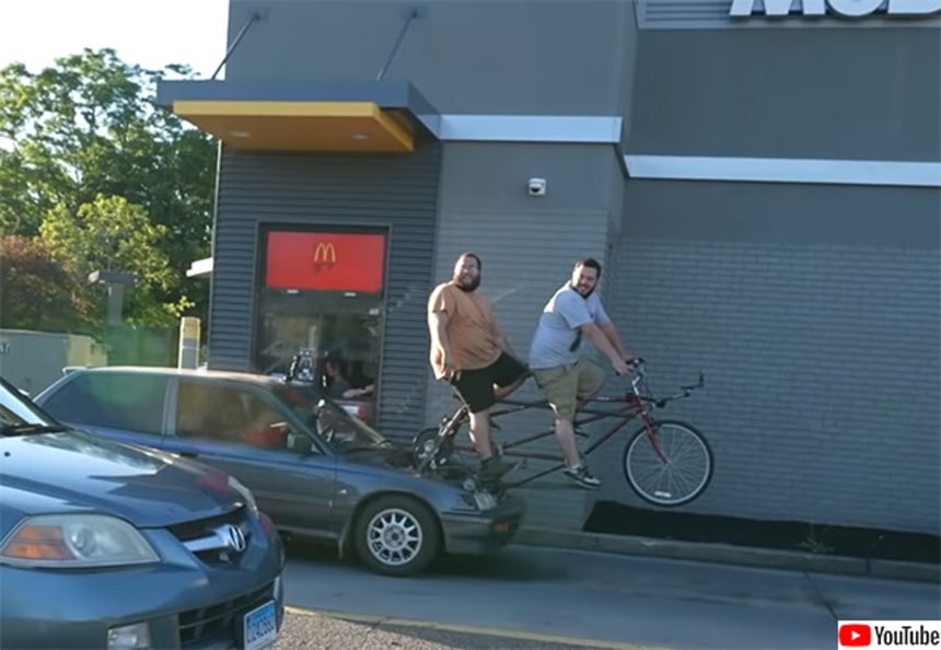 というか普通に走った方が速いし、自転車に乗っている人はヘルメットを着用してないのに、車に乗っている人はシートベルトをしているとか、ツッコミ部分は満載だけど、こういう一見無駄に思える発明から、便利で役に立つ発明につながることもあるわけだし、まあとにかく見ている分には面白そうだ。