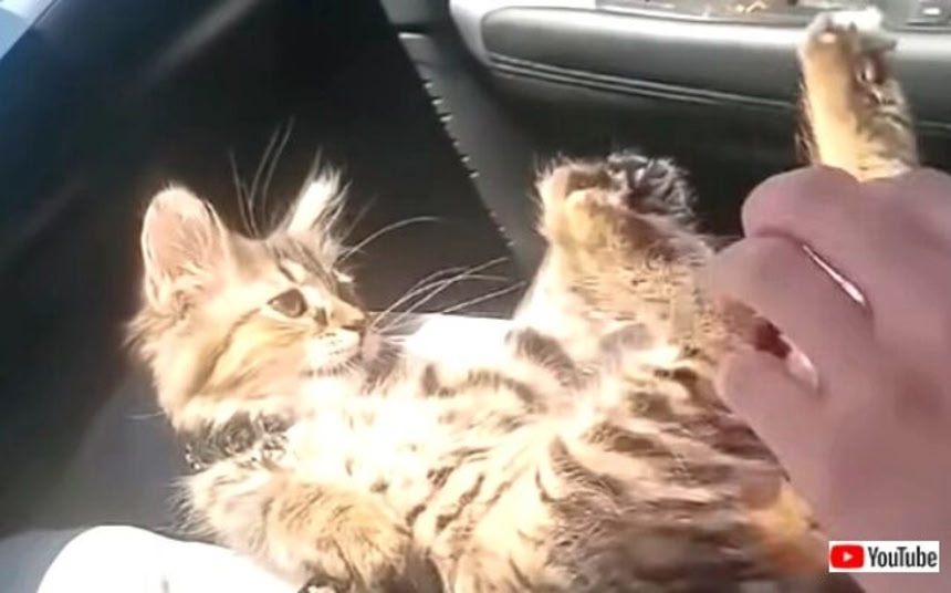 ドライブの途中で撮影されたと思われるこの動画。膝の上でうっとろりんとくつろぐ子猫のあんよをぷにぷにしていたパパ。