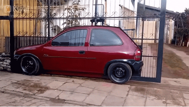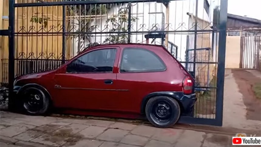 ブラジル、リオグランデにある民家の正面ゲートにはいつも赤い車が停まっている。正確には停まっているわけではなくゲートと一緒に動いている。