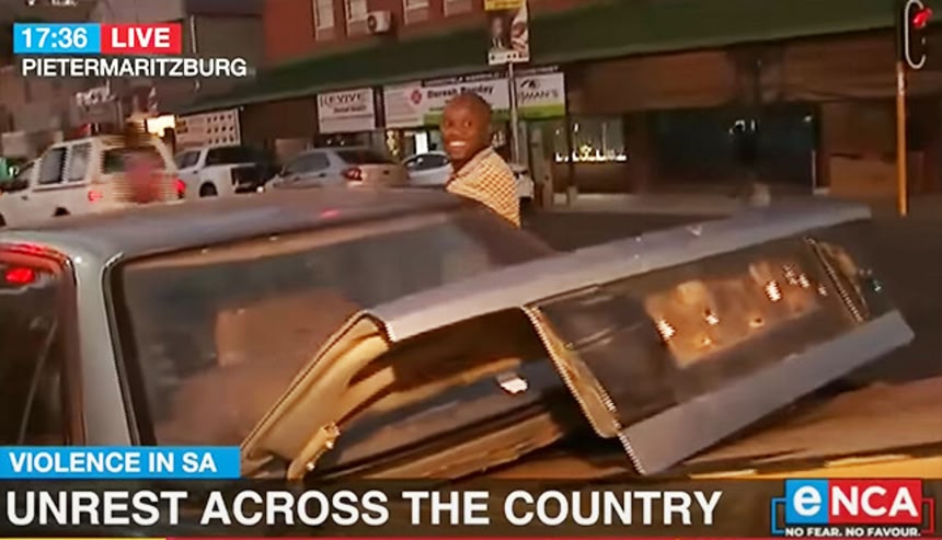 この画像を大きなサイズで見る南アフリカでは、収監されたジェイコブ・ズマ前大統領の釈放を求める抗議活動が起き、それが暴動に発展。放火や略奪行為が相次ぐ世紀末的光景が展開された。