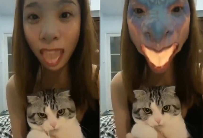 で、ここで飼い主は自分の顔を青いドラゴンに変更する加工を行ってみることに。徐々に飼い主女性の顔は変化する。