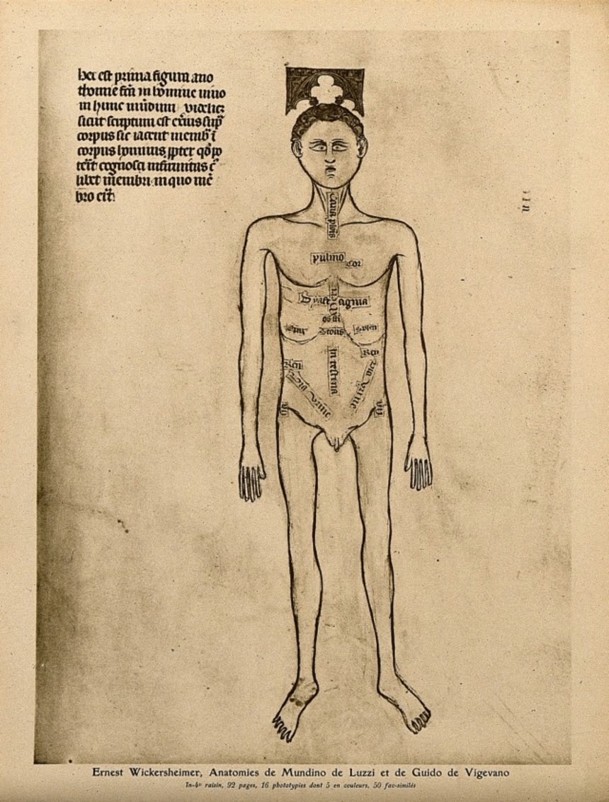 14世紀始めに 人体解剖を絵図に反映する最初の試みが始まったが、解剖がそれほど普及していなかったことや、解剖のおもな目的が人体の学術的な調査というより、医学や外科学のトレーニングや法医学の一環としての教育的なものであったため、ほとんどの場合、概略的なものにとどまっていた。