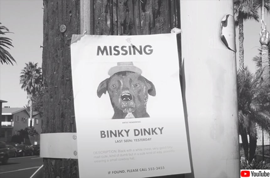 本当に居なくなってる訳ではなくて創作で「犬が行方不明になった」ていで作られたショートムービーってことかな?犬を人間に見立てて「決して1匹(1人)では見ないでください」ってジョークってことだと思う。