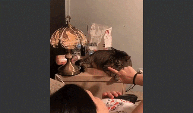 ベッドサイドテーブルに横たわる猫。その足元にはスタンドランプがある。飼い主が猫の鼻を軽くタッチすると…