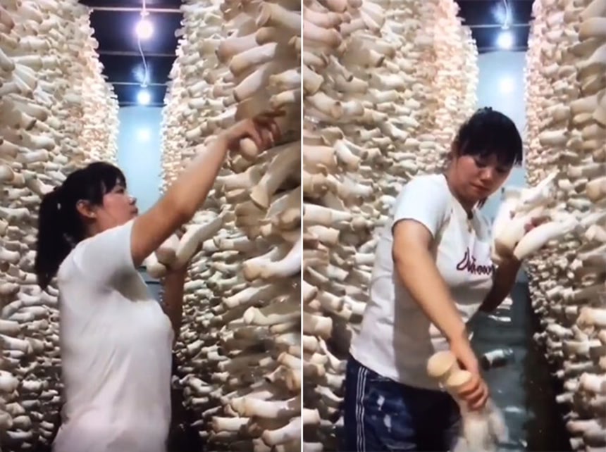 いろんな思いが胸をたぎるが、わりとサイズ感豊富なエリンギが壁一面にびっしりと生えており、女性がそれを1つずつ、やさしく丁寧にもぎっていくのである。