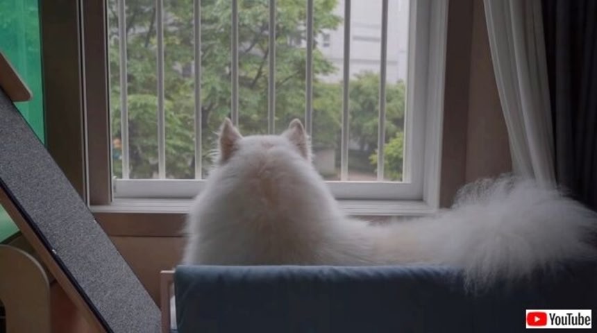 この画像を大きなサイズで見るふと気づくと、サモエド犬のミルキーくんが、窓の外の雨の景色に見入っていた。