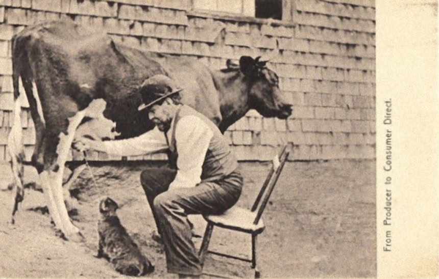 100年前、猫に搾りたての乳を与える農家の人々