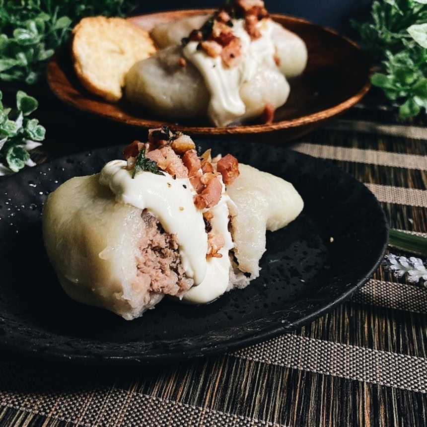 なめらかでモチモチのじゃがいもからジュワっとあふれるひき肉のうまみとトッピングの相性もばつぐん。ベーコンの塩味と玉ねぎの甘味、サワークリームの酸味がこのお料理ならではのやさしい味を引きたてる。