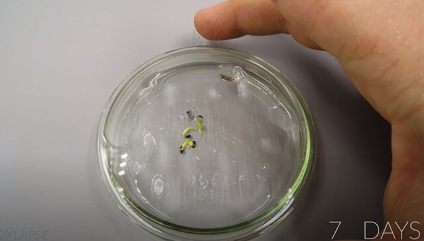 果実から種をピンセットで取ってから、土に植えて成長させるまでの113日の記録が2分に早回しされたタイムラプス動画である。