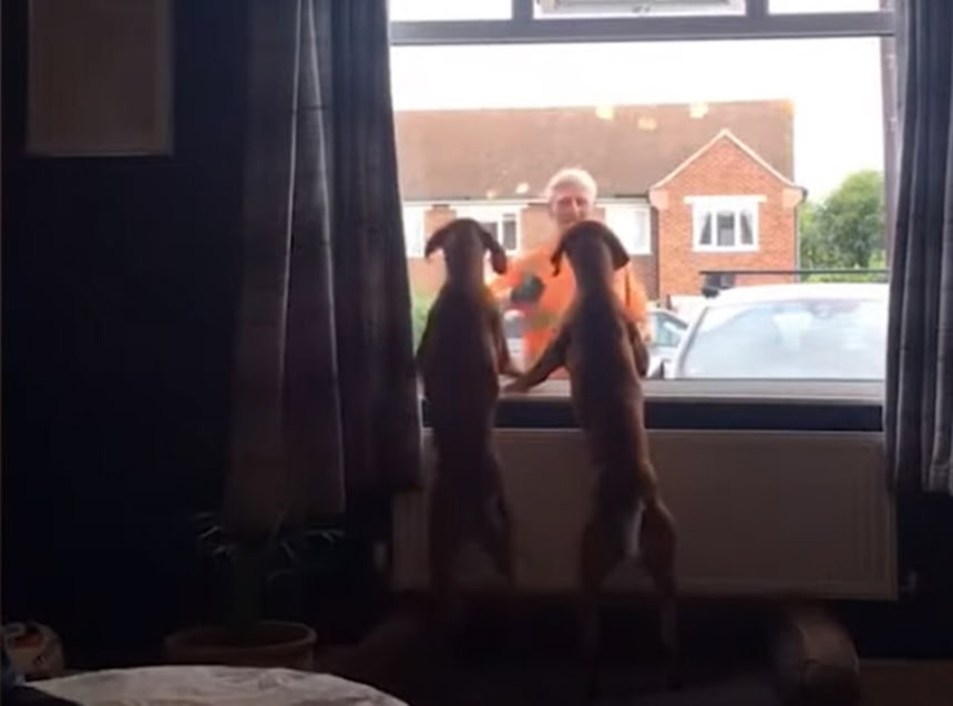 それは、毎週定期的におとずれるゴミ収集作業員のおじさんだ。おじさんは2匹の犬たちの為、この地域の回収作業の時にはおやつを持参し、飼い主の許可を取った上で窓の外からおやつを与えているという。