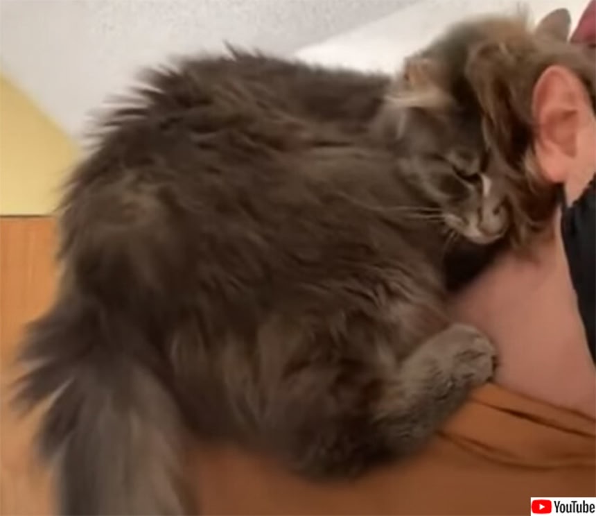その猫は、男性を見るとすぐに肩に飛び乗り、尻尾を顔に絡みつけてきたのである。究極の奥義「絡め尻尾」が決めてとなったようだ。
