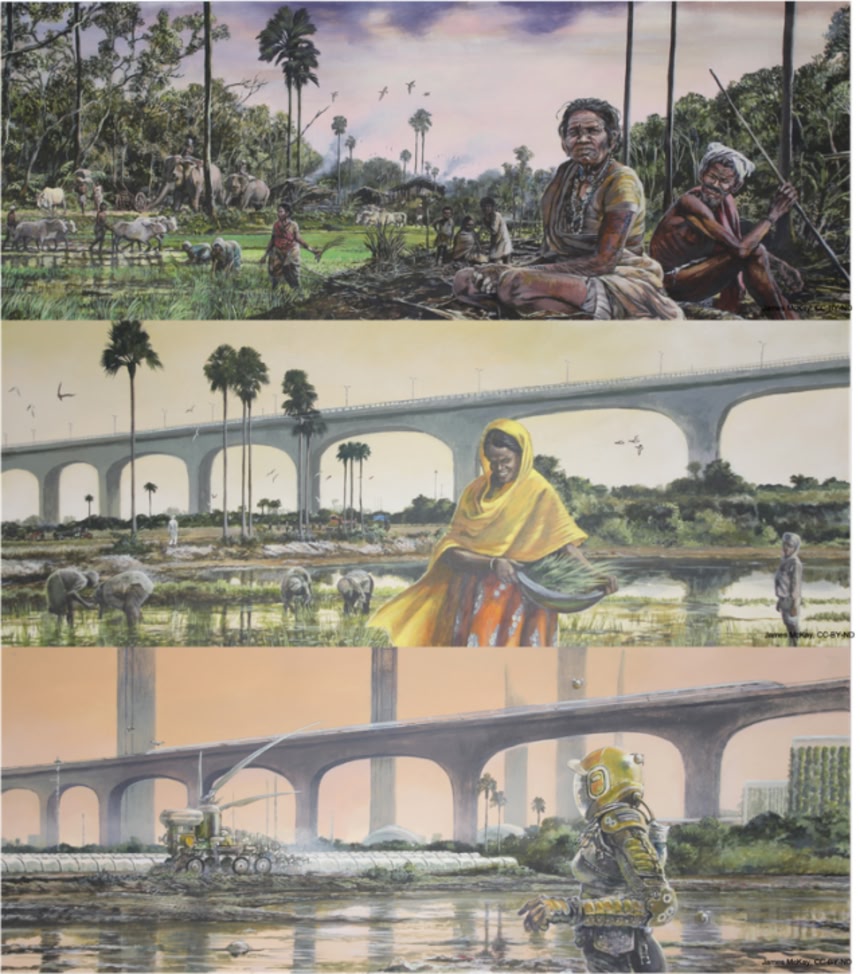 低緩和シナリオと高熱の世界が、これまで私たちが体験してきた気候に比べて、どのようなものになるかを描くために、予測と多様な研究の専門知識を用いて、3つの主要な地域(アマゾン、米国中西部、インド亜大陸)の1000年間(1500年、2020年、2500年)をカバーする9つの絵を作成した。