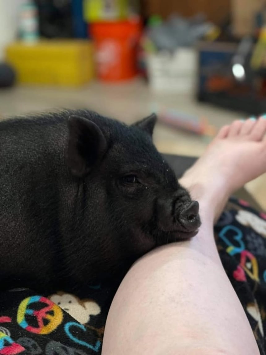 他の豚だと大き過ぎて、なかなかしょっちゅう寄り添うことはできないのですが、ローキーは私たちにべったり寄り添ってきて、そんな姿がとても愛らしいのです。