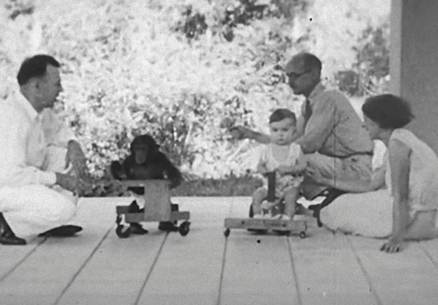 この画像を大きなサイズで見る1930年代に驚愕の実験が行われていた。比較心理学者のウィンスロップ・ケロッグ氏は、生後10か月の我が子と、生後7カ月のメスのチンパンジーを、きょうだいのように一緒に育て、チンパンジーがどれくらい人間らしくなるかを観察しようとしたのだ。