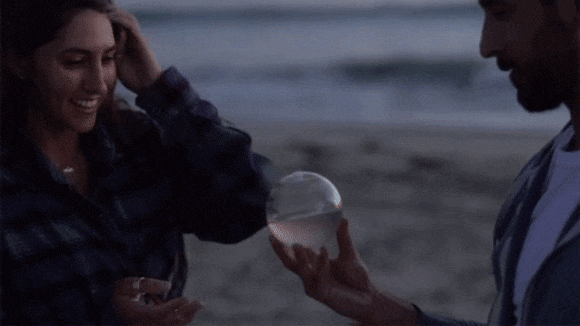 オーブを揺らし、夜光虫が光ると、オーブの中に小さな海の波が現れたかのような幻想的な世界が作り上げられる。