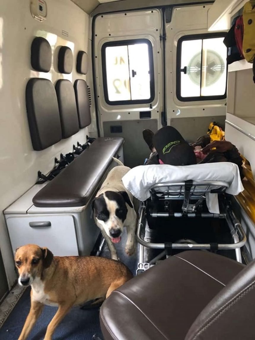 一心不乱に飼い主を心配し続ける犬たち。それを見かねた救急隊は特例で全員の搬送を決めた。おかげで2匹は飼い主と共に病院に向かうことができた。