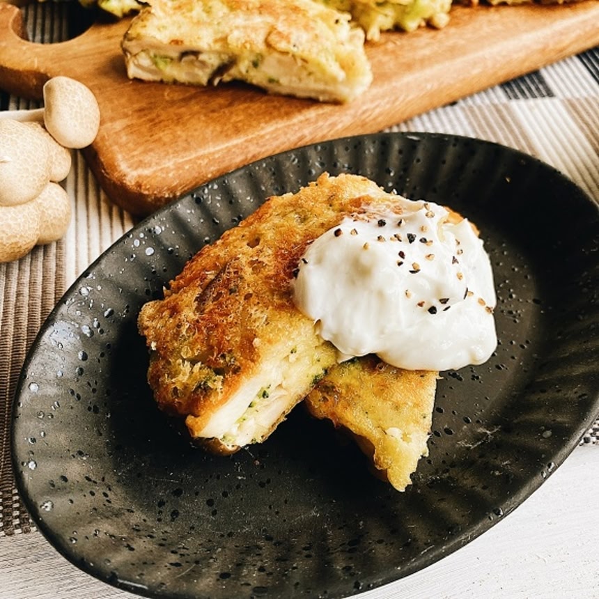 この画像を大きなサイズで見るキノコのうまみと香りを閉じこめたフリッターは食欲をそそるおいしさ。ブロッコリーとまろやかチーズで洋風お好み焼きめいた趣もある。