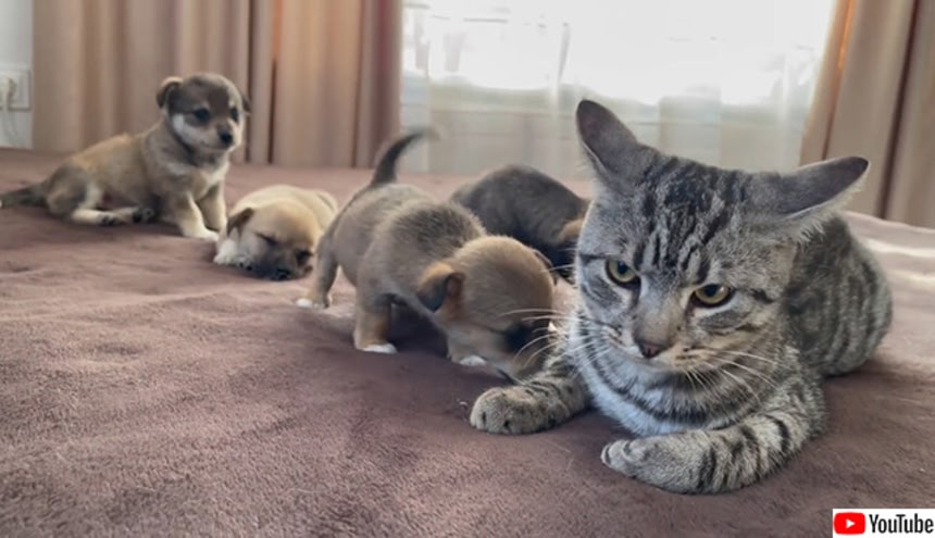 うわー、なんか小さいのたくさんいる。ベッドの上にいた5匹の子犬たちに困惑の表情を見せる猫。ただ寝ててくれればまだよかったのだが、猫に気が付いた子犬が近づいてきた。