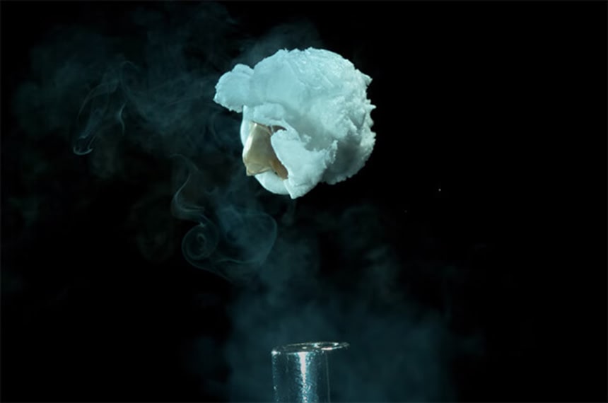 この映像は、ウルトラハイスピードカメラ「Phantom v2512」を使用して撮影されたもので、真空ポンプを使用してポット内の空気圧を下げることで、通常よりも早く大きく膨らませることができたそうだ。