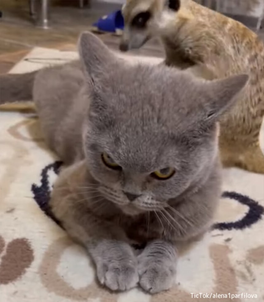 この画像を大きなサイズで見るそんな猫とミーアキャットの日常はTicTocアカウント「alena1parfilova」で見ることができるよ。