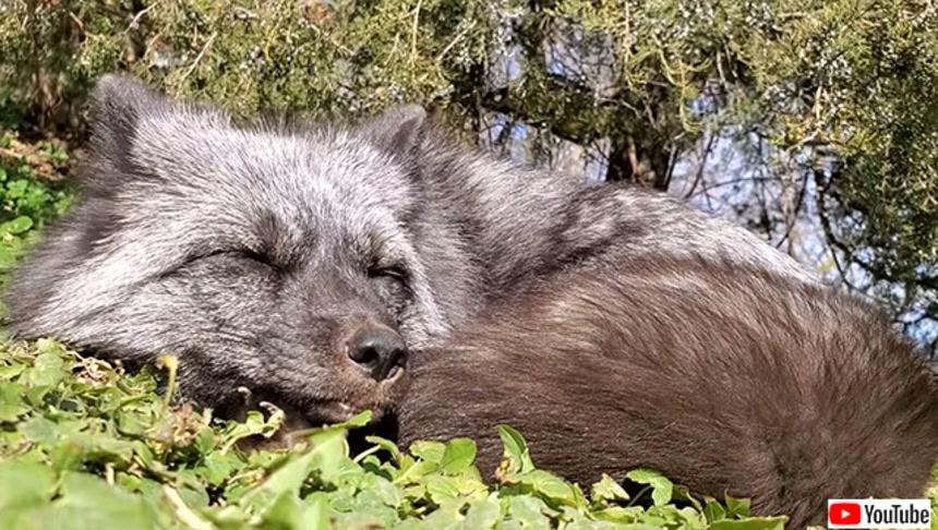 この施設で暮らすハイイロギツネのムーティアスはおしゃべりが大好き。お昼寝中もなにやら夢を見ているようで、かわいらしい声で鳴いている。
