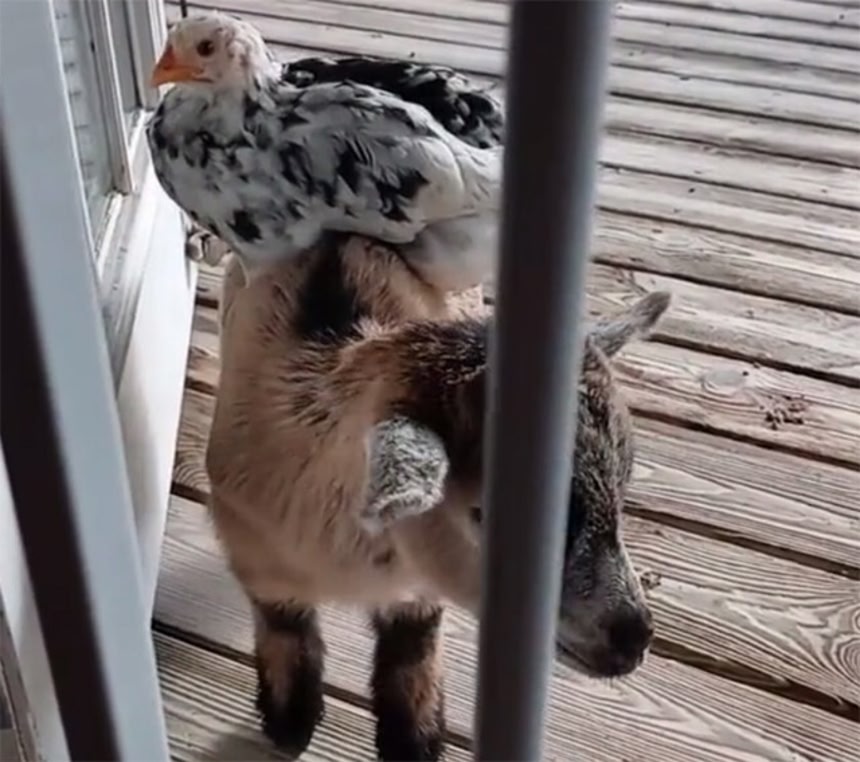 この日子ヤギは背中にニワトリを乗せ、ポーチの前にたち、中に入れてほしそうに飼い主を見ていたという。