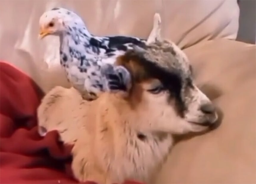 この画像を大きなサイズで見るというかソファの上でもヤギの背中に乗って仲良く寄り添っている所を見ると、本当に仲がいいんだね。ヤギっことニワトリは。