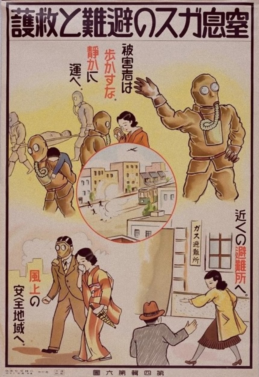 この画像を大きなサイズで見る1937年より日中戦争が始まり、日本国内では毒ガスによる空襲に備えて、日本赤十字が政府当局と協力しポスターを作成した。