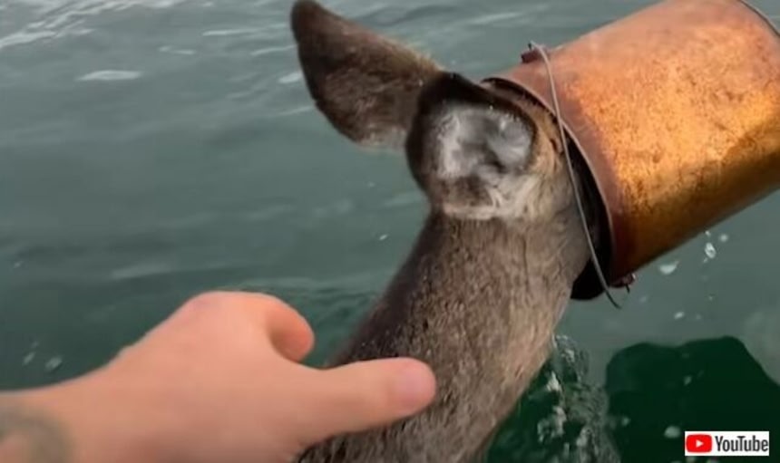 この画像を大きなサイズで見るボートのおかげでスムーズに鹿に近づけたフランキーさん。スポンとバケツを外してやることに成功!