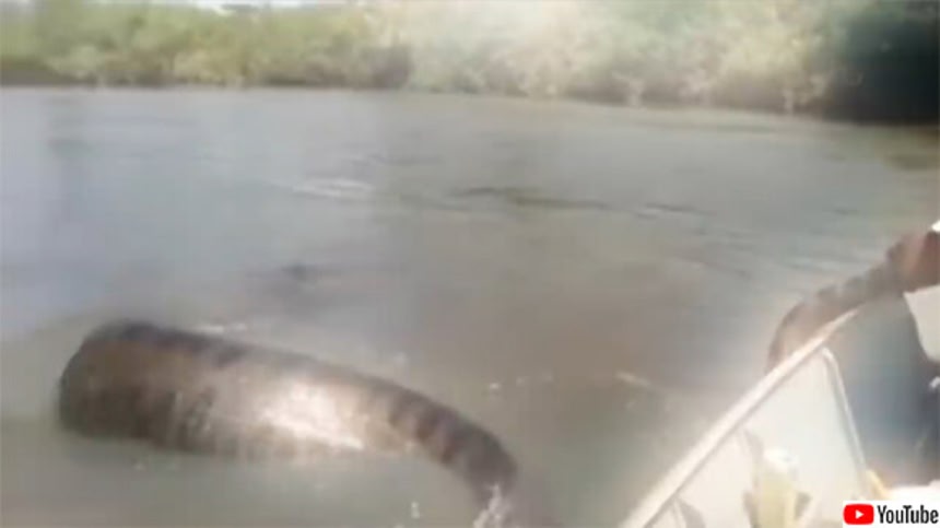 元の動画はブラジル南西部サンタマリア川で撮影されたもので、ボートに乗っていた漁師が川岸でとてつもなく巨大なアナコンダを見つけるところから始まる。
