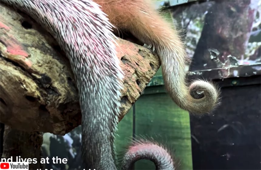 オマキヤマアラシは成長すると、腹部と尻尾以外は針毛で覆われる。以下の動画はシンシナティ動植物園にいる、大人のオマキヤマアラシ、リコさんの姿だ。