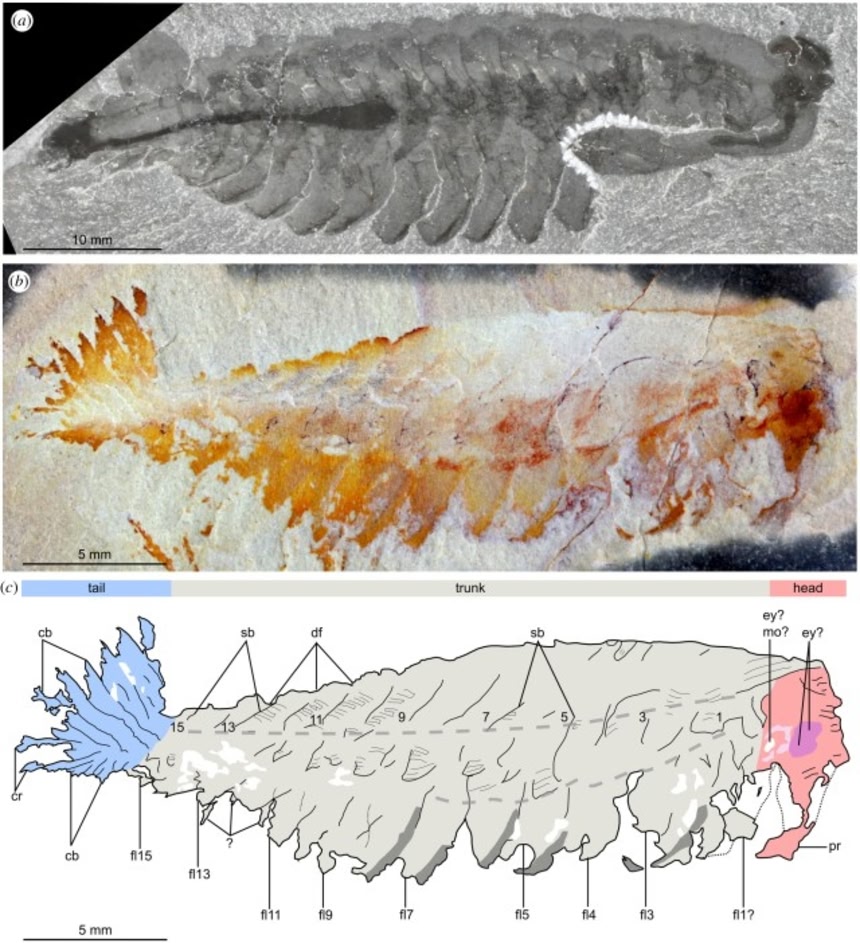 これは重要なことだ。なぜならオパビニア類の大きな特徴が、5つの目と頭部の吻だからだ。その代わりに、背中に沿った体節の溝や1対のノコギリ状の尾ビレはよく保存されている。