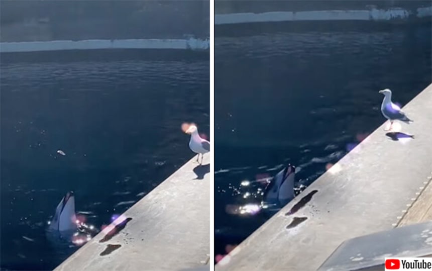 おこぼれの魚を狙いにやって来たカモメに対し、イルカは、口に入れた魚を空中に放り投げてまた口に戻す。これを何度も繰り返す。
