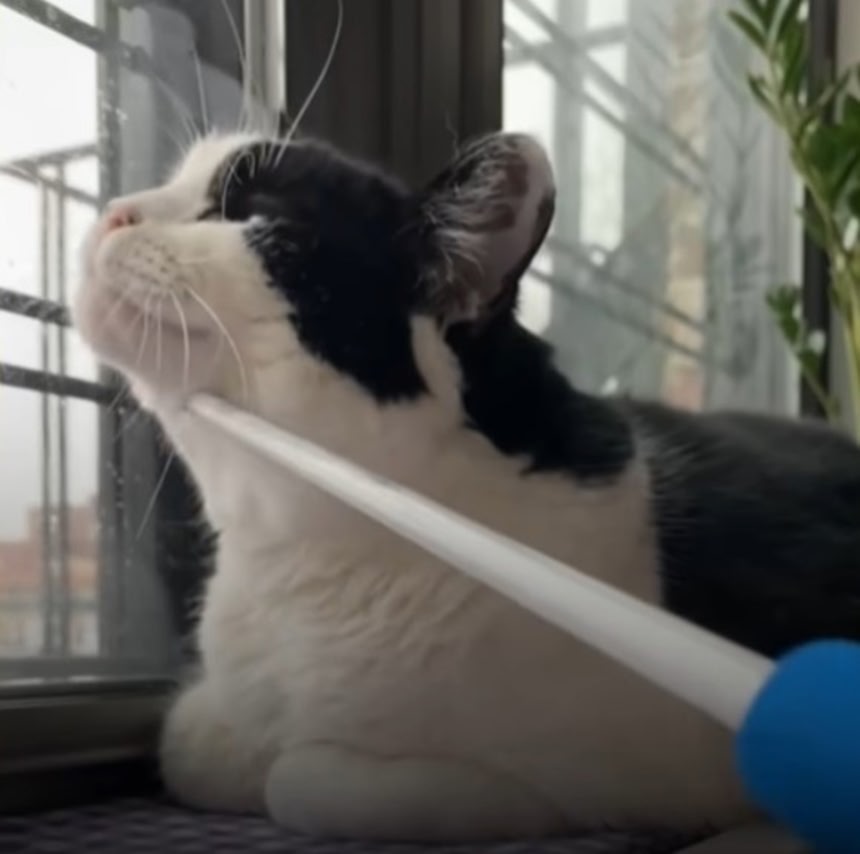 この画像を大きなサイズで見る更に、そのおもちゃの先端を使ってジアを撫で始めると、やがてジアはステイシアさんに直接触れられても逃げたり怒ったりすることなく、すんなりと受け入れるようになった。