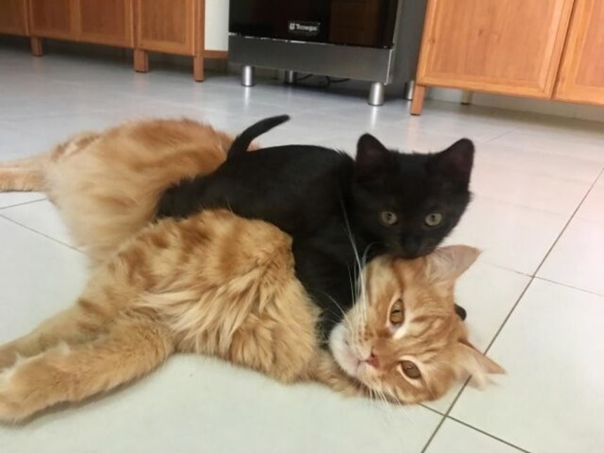 どっちの猫もたくさん食べてたくさんヒゲメンの肩を登って大きく逞しくなるんだよ