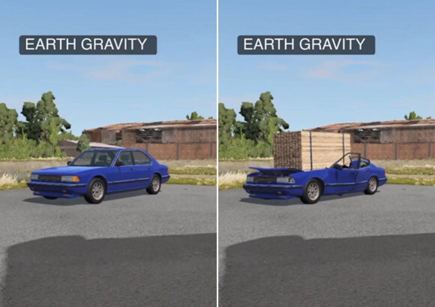 木材が車めがけて落下する。惑星の重力比較アニメ